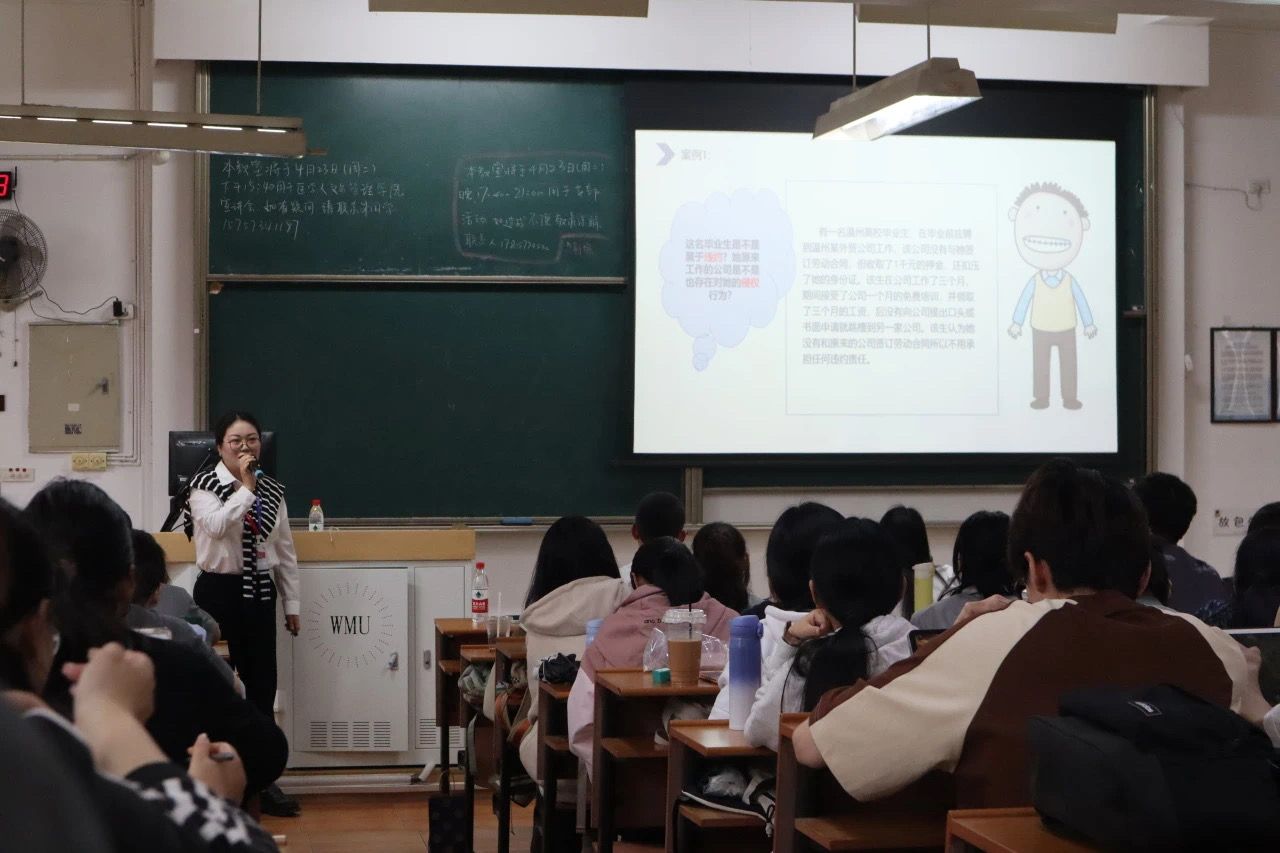 接下来是黄荟颖经理为大家普及劳动权益保障知识。她用通俗易懂的语言通过引用现实案例向大家介绍了劳动双方常见的侵权违法行为与遇到劳动争议时的避“坑”小技巧,进一步加深了同学们对劳动权益保障知识的了解,提高同学们的防范意识。