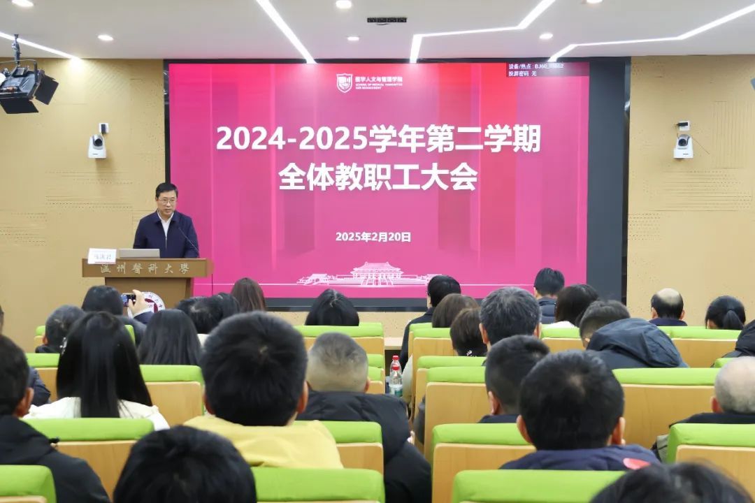 2月20日下午,K8召开2024-2025学年第二学期全体教职工大会,全院教职工齐聚一堂,锚定目标,共话发展。会议由党委书记马洪君主持。