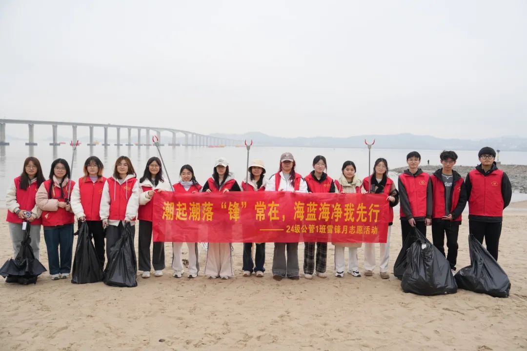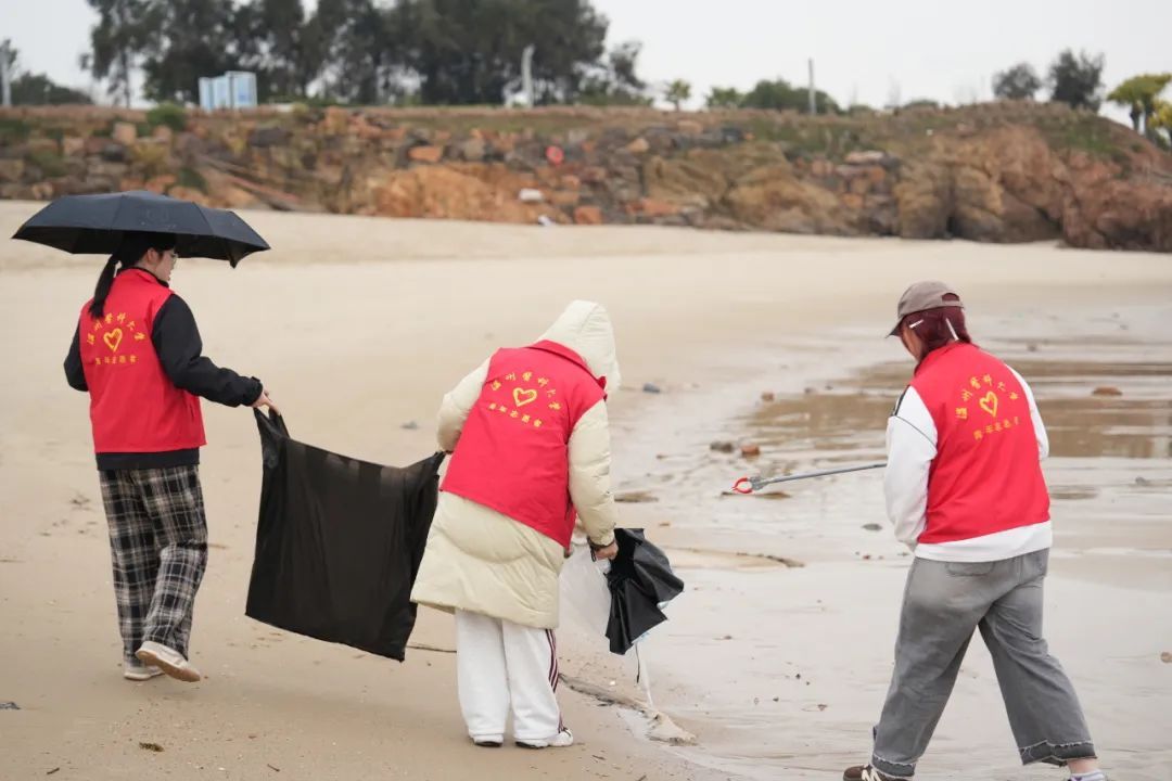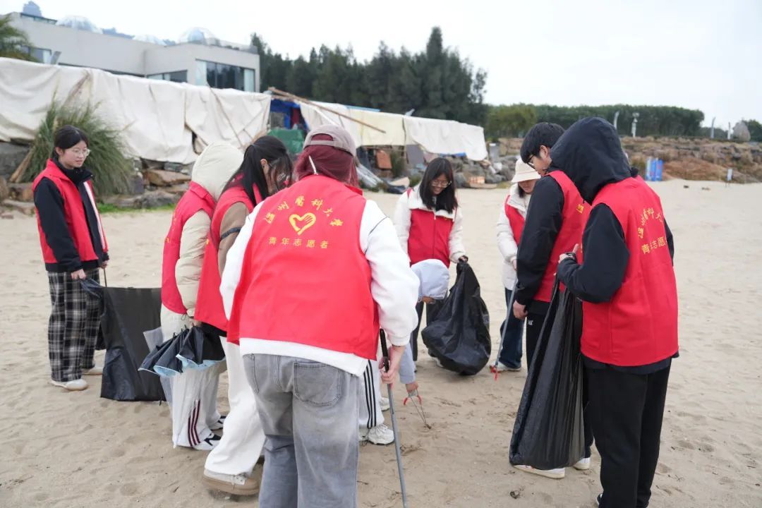 洞头同心公园的海岸边,一场特别的净滩活动在细雨蒙蒙中拉开帷幕。24级公管1班的同学们,怀揣着对海洋的热爱与对环保的执着,迅速分散在海滩各处。他们手持垃圾袋和清洁工具,弯腰、捡拾、装袋,认真清理着沙滩上的塑料瓶、包装袋、烟头,甚至连礁石缝隙中隐匿的垃圾也不放过。细雨蒙蒙,海风带着咸涩的气息拂过脸颊,却丝毫浇不灭他们的热情,也吹不散他们的决心。数小时后,同心公园的海滩焕然一新,曾经被垃圾“点缀”的沙滩,如今干净整洁,仿佛在向这群年轻的守护者致以最深的谢意。