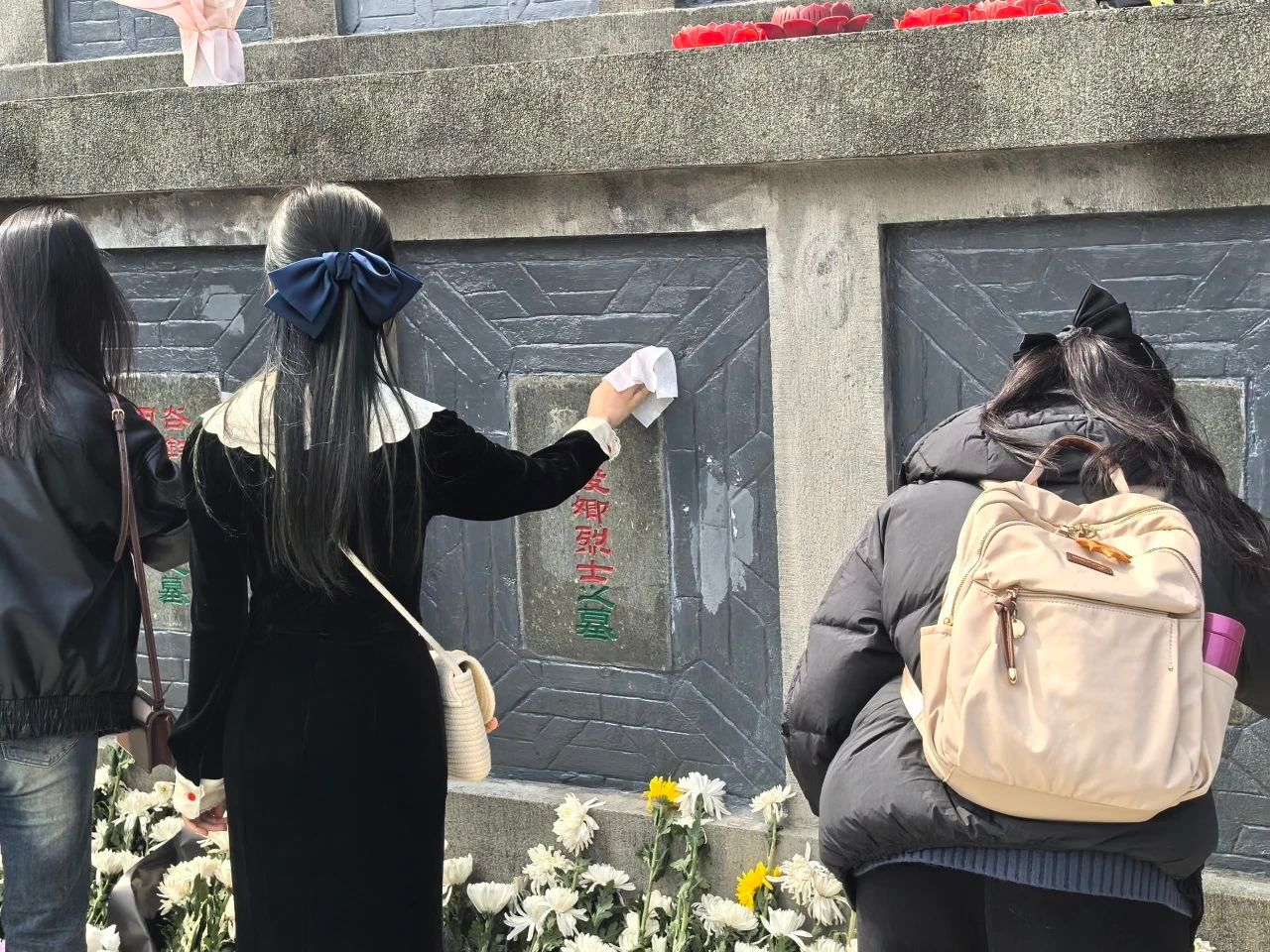 在庄严肃穆的烈士陵园,24公管3班同学们轻轻走近墓碑,用柔软的布仔细擦拭。每一下动作,都带着对先烈的敬重,寄托着无尽的缅怀 。