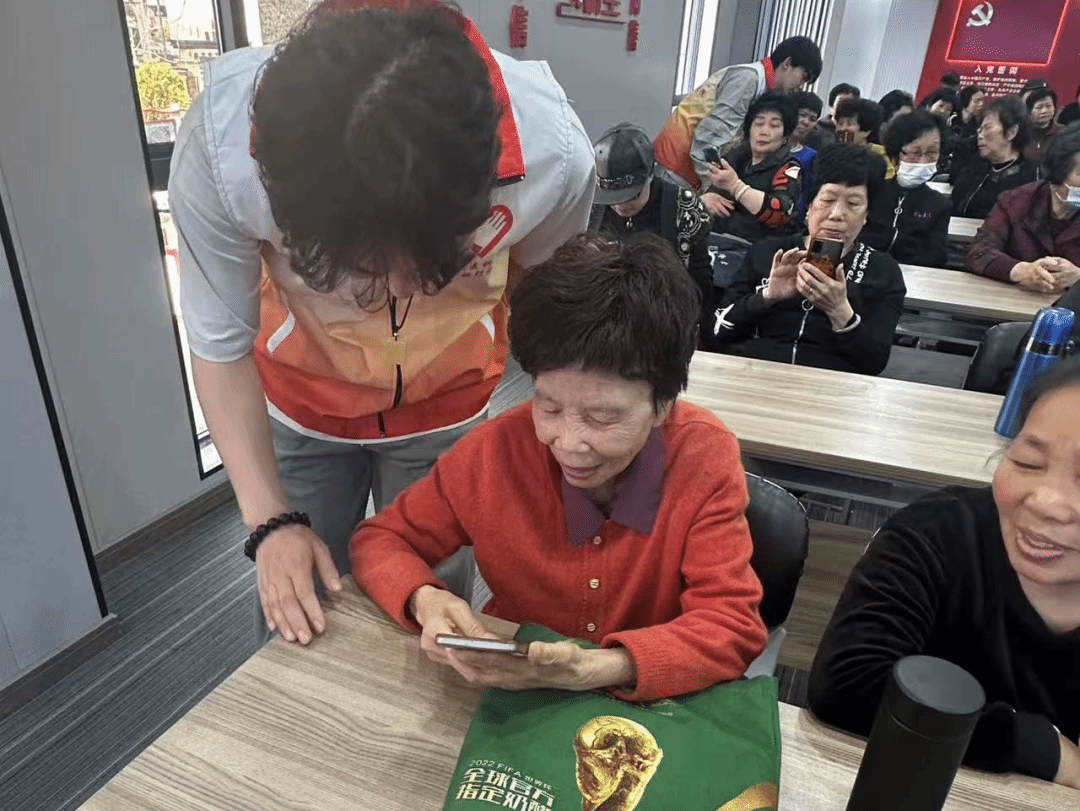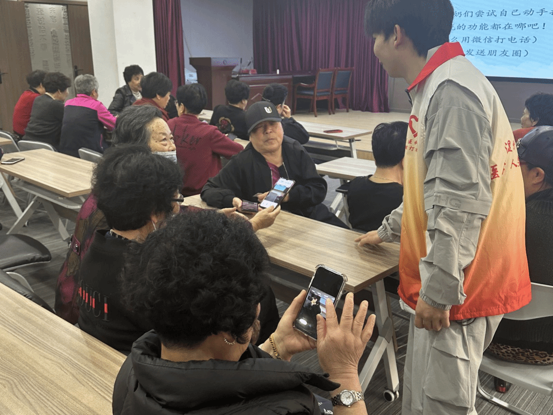 在动手环节,老人们热情高涨地尝试着刚刚学到的技能,现场一片热闹景象。志愿者们穿梭其中,耐心细致地为老人们提供指导。有的老人正专注地练习语音通话,有的则尝试发送朋友圈,整个活动现场洋溢着积极向上的氛围,充满了温馨与活力。