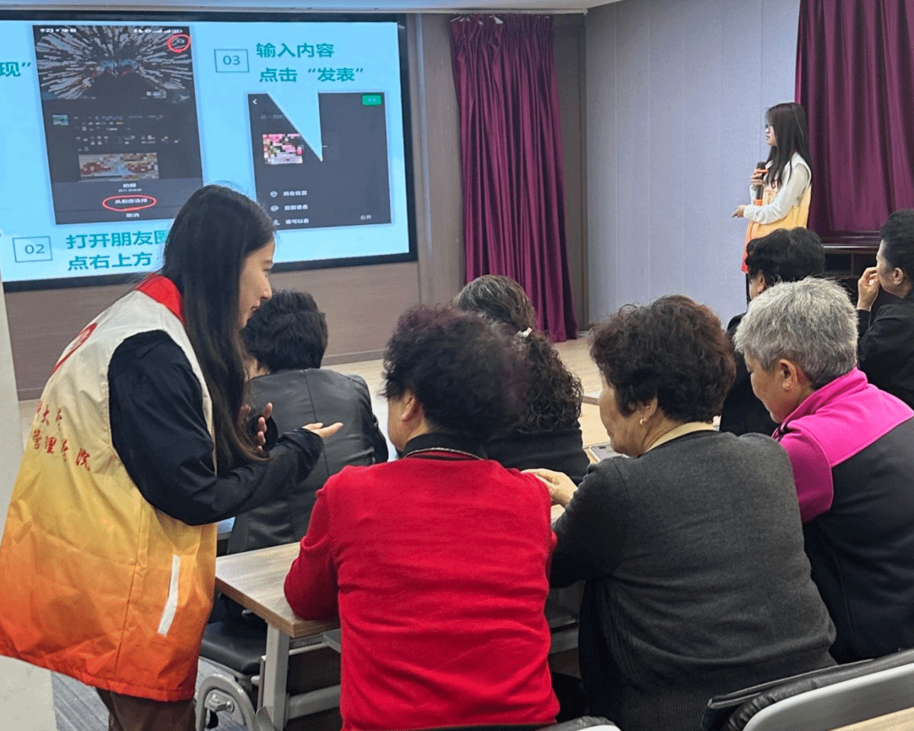 活动伊始,志愿者们与老人们一同回顾了上期内容——搜索有趣信息与关注感兴趣的人。老人们积极分享着自己的收获,脸上洋溢着自豪与喜悦。这一环节不仅巩固了之前的知识,更激发了老人们继续探索数字世界的热情。