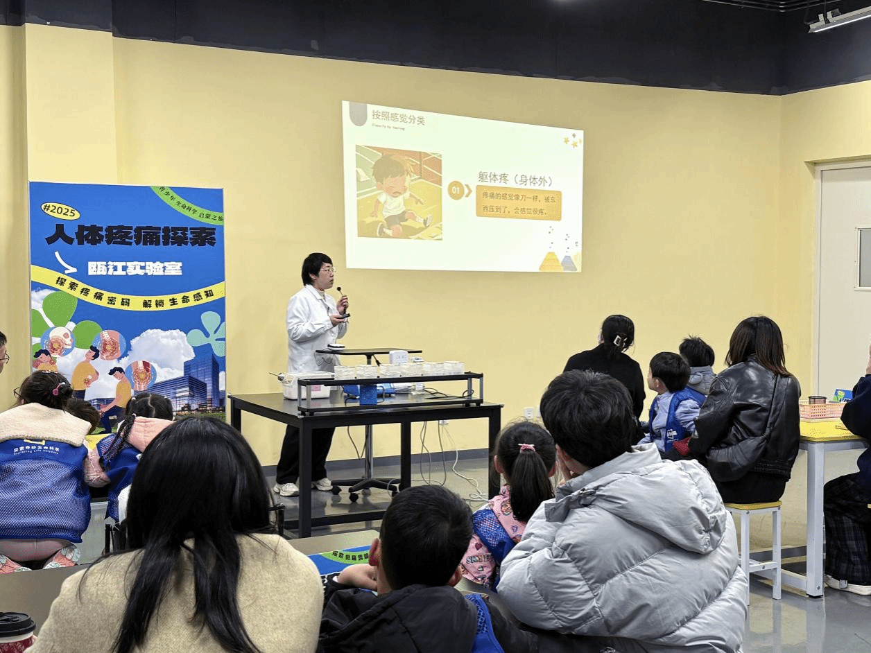 午后,《人体疼痛探索》研学课程在全景展厅开讲。三名项目组成员化身“课程助教”,带领幼儿园小朋友以“科学小侦探”的身份开启“疼痛王国”的探秘之旅。孩子们通过科学家的趣味科普,观察动物实验模拟,在互动中理解生命感知的奥秘。员工助教孙晶晶分享道:“当孩子用稚嫩的声音问‘为什么伤口会痛’时,科学家用童话语言拆解专业知识,那一刻我深刻体会到,医学不仅是技术,更是与生命对话的艺术。”
