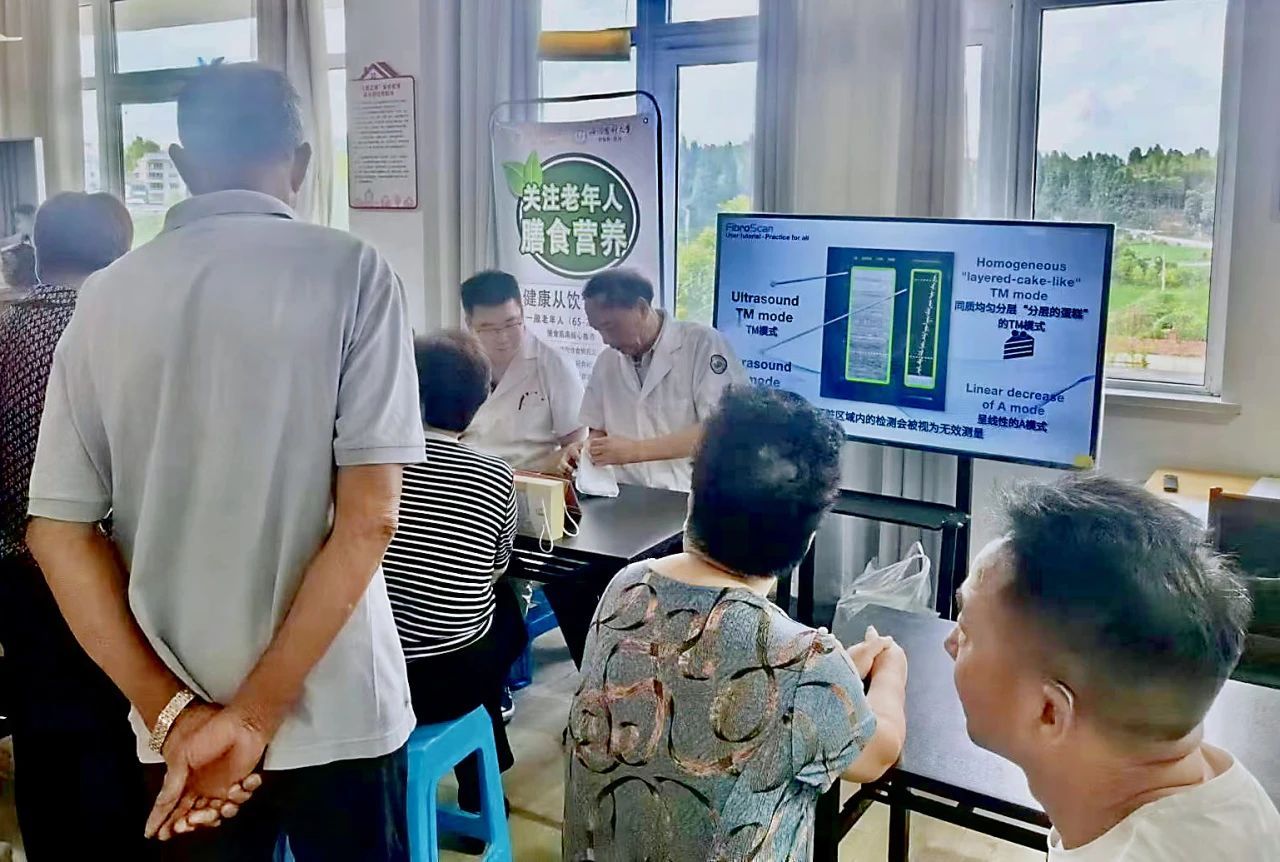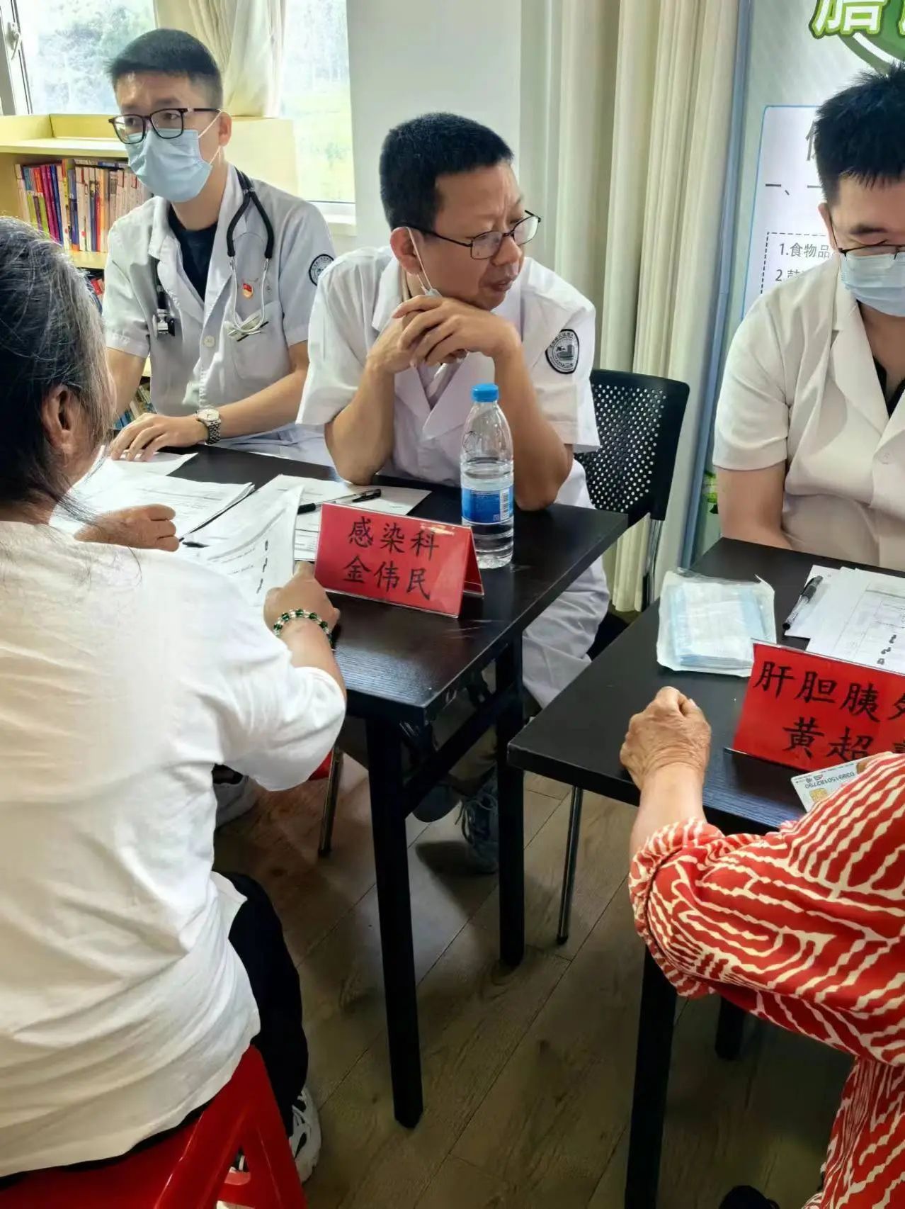 肝胆胰腺外的黄医生和感染科的医生则耐心地询问居民的病史和身体状况,为他们进行腹部触诊等检查,并就脂肪肝、肝硬化等疾病的预防和治疗进行详细的讲解。