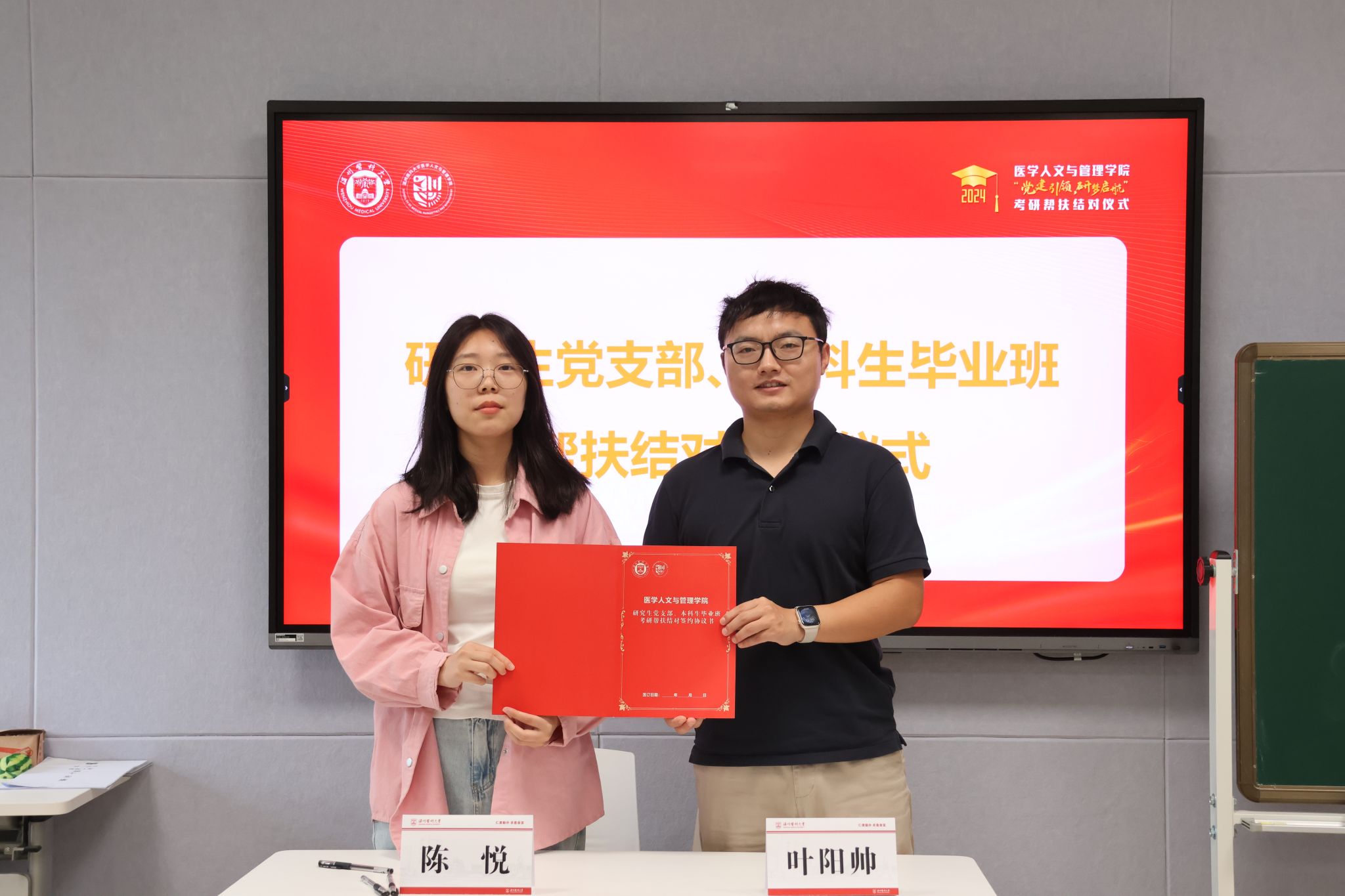 辅导员叶阳帅老师代表27名受帮扶本科生员工与研究生党支部书记陈悦完成了签约仪式。