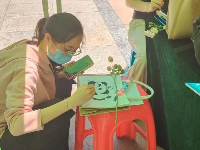活动当天,同学们一起围坐在同德楼前的草坪上,用画笔在帆布袋上自由挥洒创意。一些同学专注地勾勒可爱的卡通人物,另一些同学通过抽象图案表达内心感受,还有同学为喜欢的动物添上鲜艳色彩。