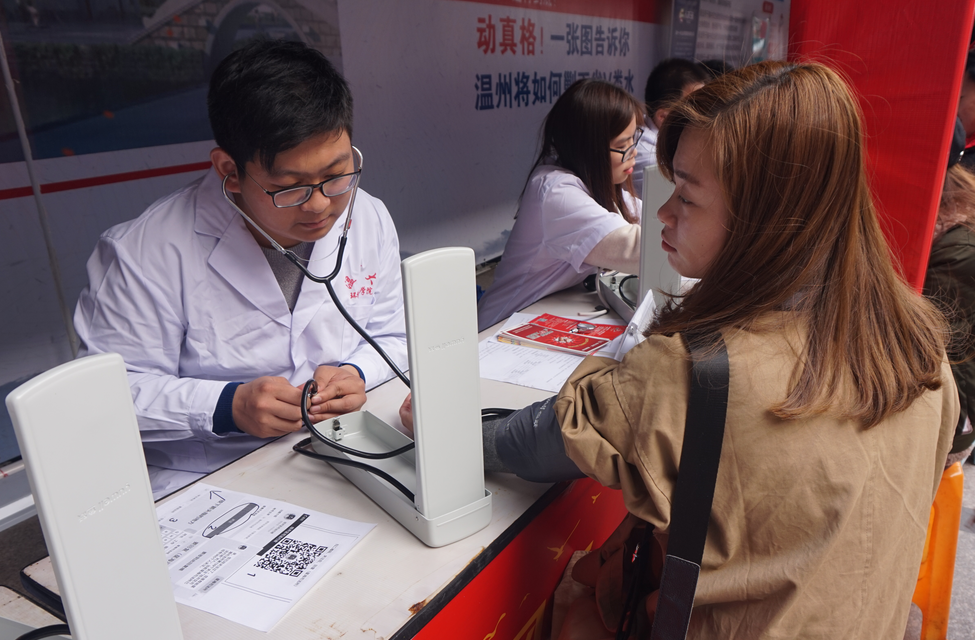 乍暖还寒时期,伴随着阵阵凉风,同学们换上白大褂,摆放好听诊器、血压仪等医用器械,在社区居委会提前搭好的帐篷内等待着居民们的到来。此次义诊共有三项服务:测量血压,测量血糖,按摩。活动开始不久,便有居民陆陆续续前来体验。“同学,你们这个服务是免费的么?”“对的,我们是来做义诊的,不收费。”同学们认真专注的为居民做检查,若测量结果与健康水平偏离,我们的“小医生们”会这样关心叮嘱居民:“请您平时一定要保持良好的饮食习惯,少吃腌制、油炸的食品,不要太劳累,注意休息。一段时间后这种情况就会改善的。”同学们不仅细心地为居民们提供服务,而且附以耐心的提醒,居民对同学们的态度也是不住称赞。