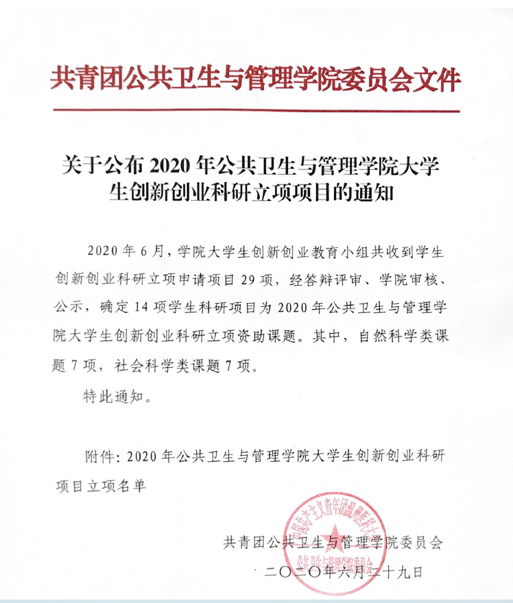 关于公布2020年公共卫生与管理公司老员工创新创业科研立项项目的通知